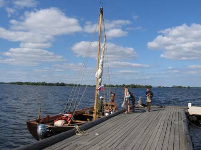 Конечно, подошли полюбоваться, слово за слово, и разговорились с капитаном, добродушным симпатичным молодым мужиком. Оказывается, на самом деле у него карбас, декорированный под ладью, причём всё он сделал сам. Хоть у ладьи и есть мотор, в основном плавает капитан на парусах. Этой ладьёй он и зарабатывает, устраивая парусные походы за 10000 рублей в день. Если набрать группу в 10 человек, то по тысяче с каждого на целый день – не так уж и много. Вот и сегодня он привёз группу людей посмотреть Кижи.