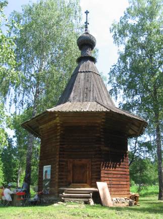 Немного поодаль от избы стоит часовня, воссозданная по чертежам постройки XVIII века. Она тоже, как и скит, всё время закрыта.