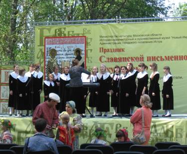 Тут мы и поняли, в чём причина народного оживления – отмечался праздник Славянской письменности в честь недавно прошедшего дня святых Кирилла и Мефодия, просветителей Руси. Рядом с усадьбой на сцене благолепно пели сладкоголосые хоры, которым внимали многочисленные зрители, тут же проводились викторины и конкурсы для детей, неподалёку развернулась Ярмарка мастеров.