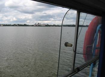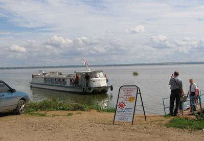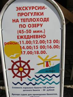Ещё перед входом в кремль нас привлекла реклама прогулок-экскурсий на теплоходе по озеру Неро, курсирующем каждый час, 150 руб. со взрослого и 50 с детей. Как раз за 15 минут до 15-ти часов мы и поспешили к теплоходу, уминая на ходу купленные заранее в Угличе по божеским (можно сказать, советским) ценам вкуснейшие пирожки и хот-доги и любуясь на девушек, проводящих раскопки у стен кремля.