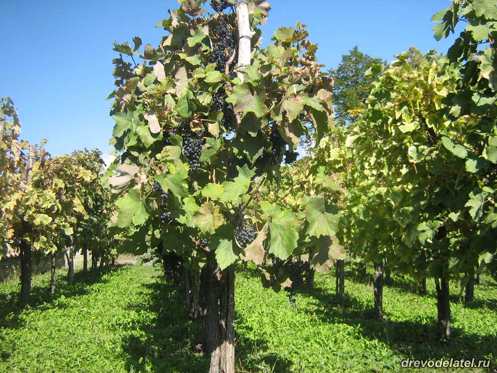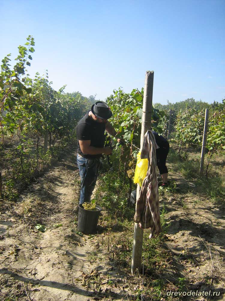 Чтобы снять гроздь винограда, нужно, придерживая его снизу одной рукой, срезать с лозы и, придерживая руками, аккуратно положить в ведро. Нагнулся — разогнулся, и так с каждой гроздью.