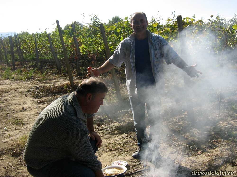 Я впервые в жизни собирала виноград — скажу прямо, тяжёлый труд. После непродолжительной работы — грузинское застолье: вино, шашлык, овощи и многое другое, и, конечно, тосты и мужское многоголосие.