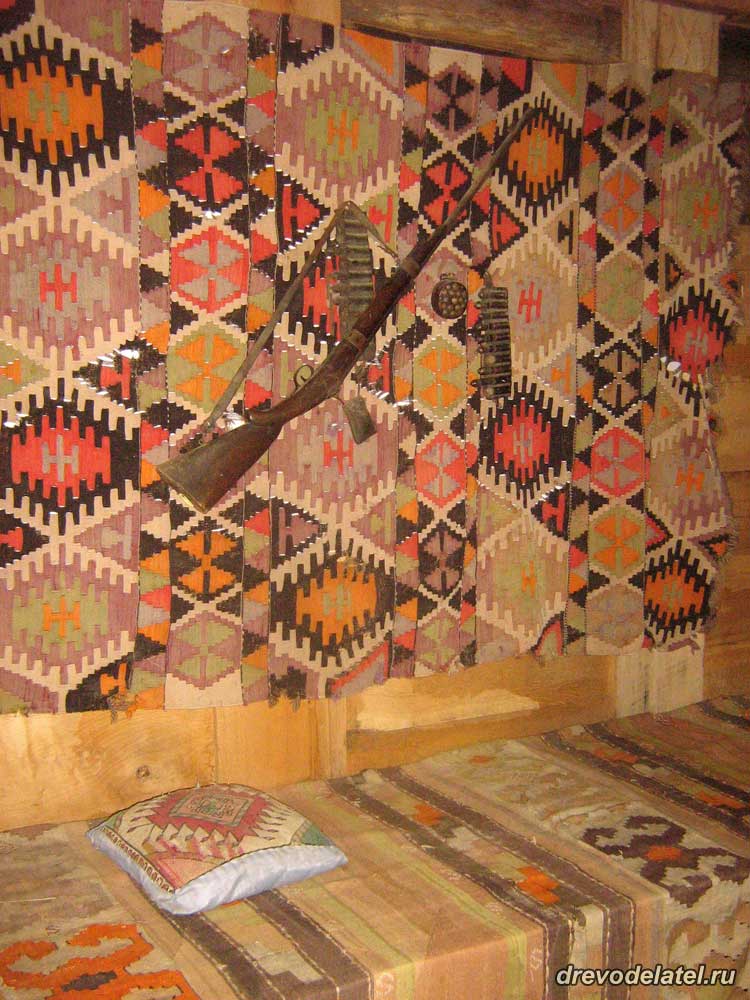 Слева от стола — оригинальная скамья: сиденье положено на вязанки из виноградных веток.
