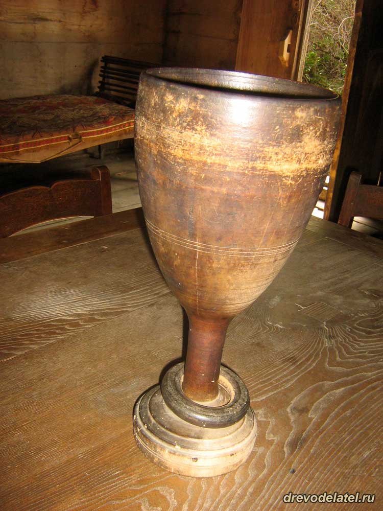 За искусно выточенную деревянную чашу могли отдать и корову — вот так высоко ценился труд мастера. Чаша на фото — трёхлитровая, чаша и кольцо выточены из цельного куска дерева. Звук стука кольца о дно чаши означало, что вино выпито.