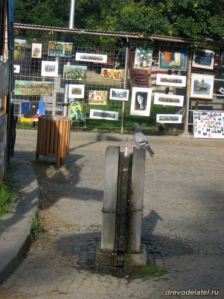 Голубь пьёт воду из стойки-краника, которых много установлено в Тбилиси.