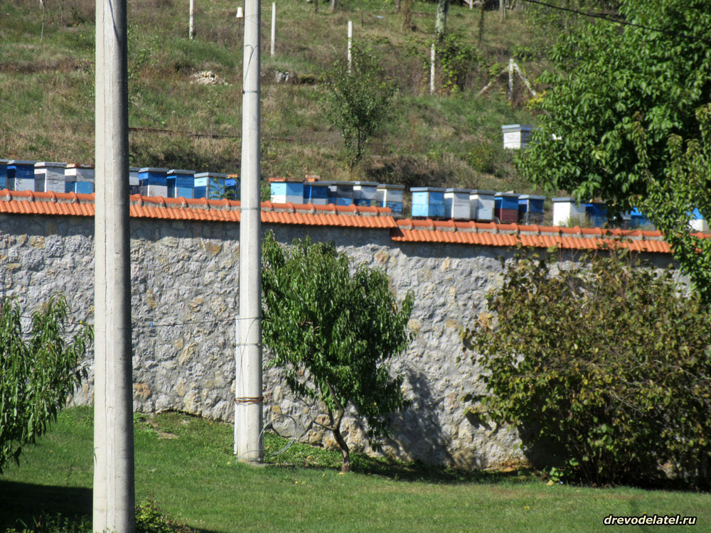 Пчелиная пасека с ульями за монастырской оградой