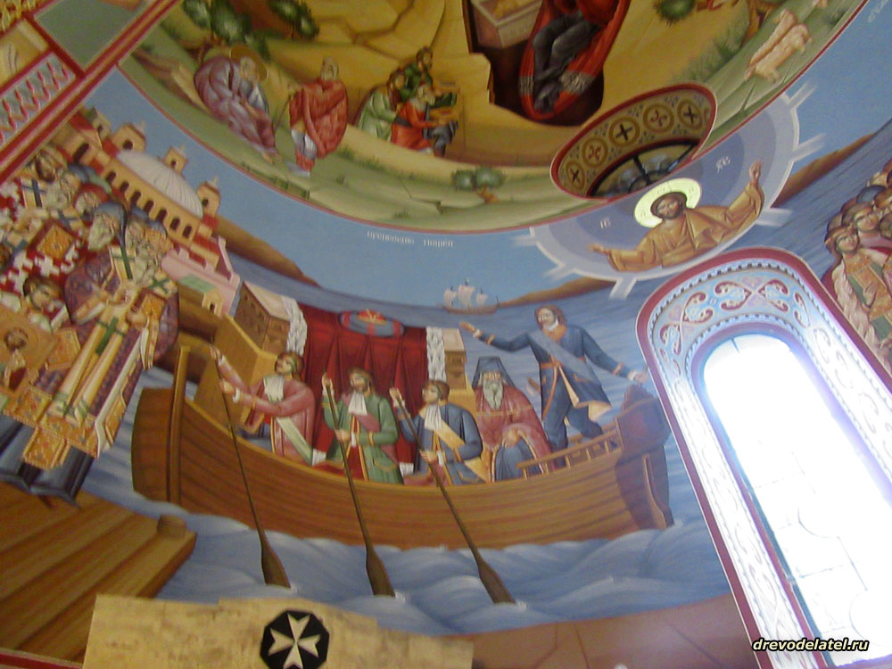 Фрагмент храмовой росписи: Император Пётр I-ый плывёт в лодке.