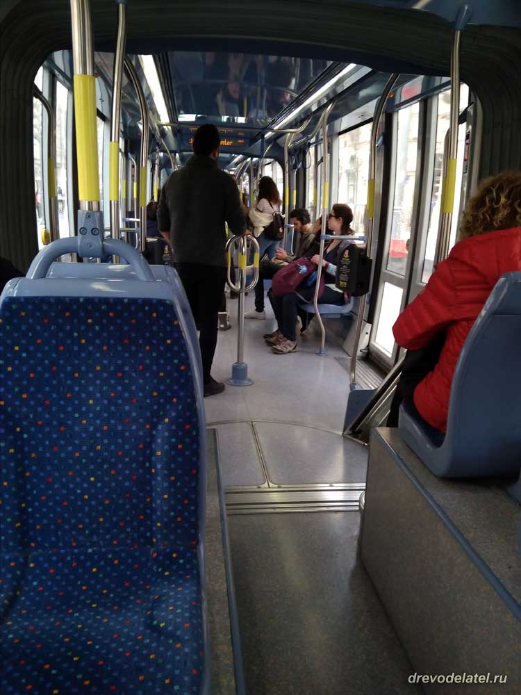 Турникетов в трамвае нет, но периодически заходят кондукторы и проверяют билеты. Двери открываются после нажатия на сенсорную кнопку на двери, так что часто, когда трамвай уже закрылся и собирается отъезжать, подбегают не успевшие сесть, нажимают на кнопку и спокойно заходят в трамвай.