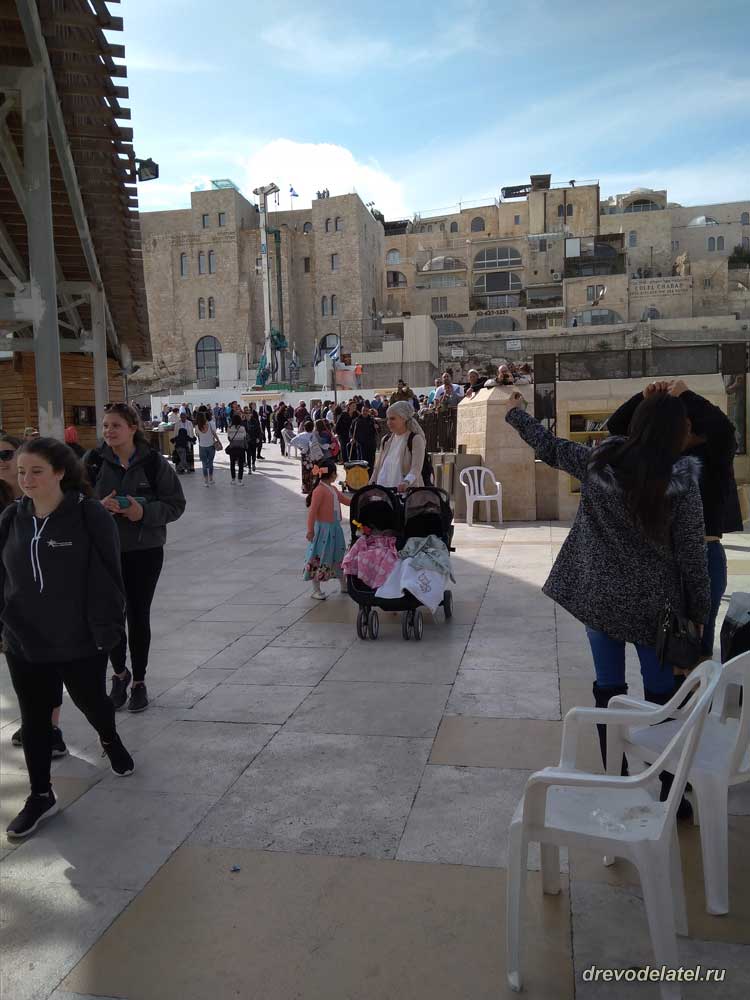 Большая часть иудеек в юбках, платьях, с покрытыми головами. Много многодетных семей, 4 ребёнка — обычное дело, мы видели и больше. Причем матери не только молодые, но и за 30-40 лет. Много беременных. Видно, что в государстве мощная социальная поддержка для своих граждан, чтобы они, не боясь, спокойно рожали и жили, воспитывая детей. Иудеи в чёрных костюмах, в кипах и шляпах.