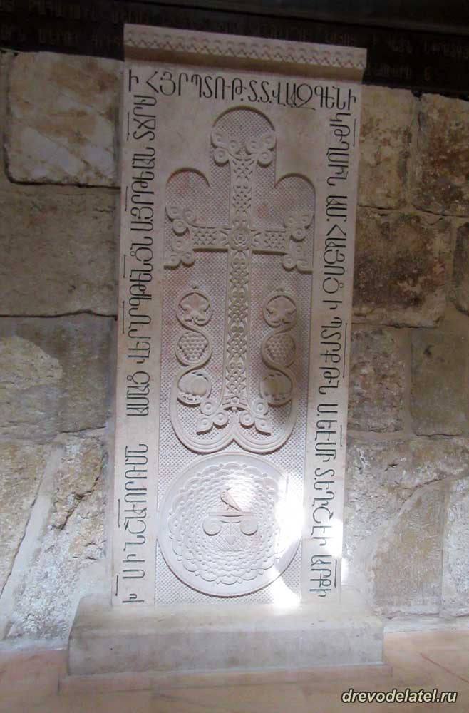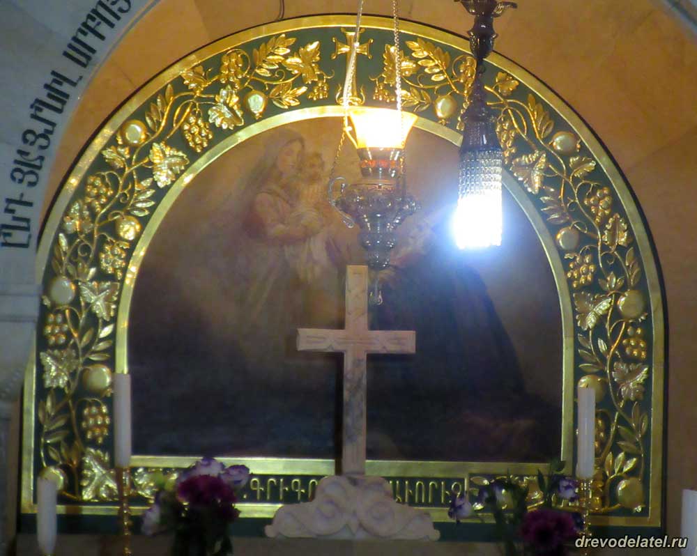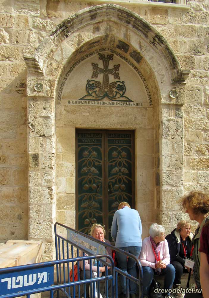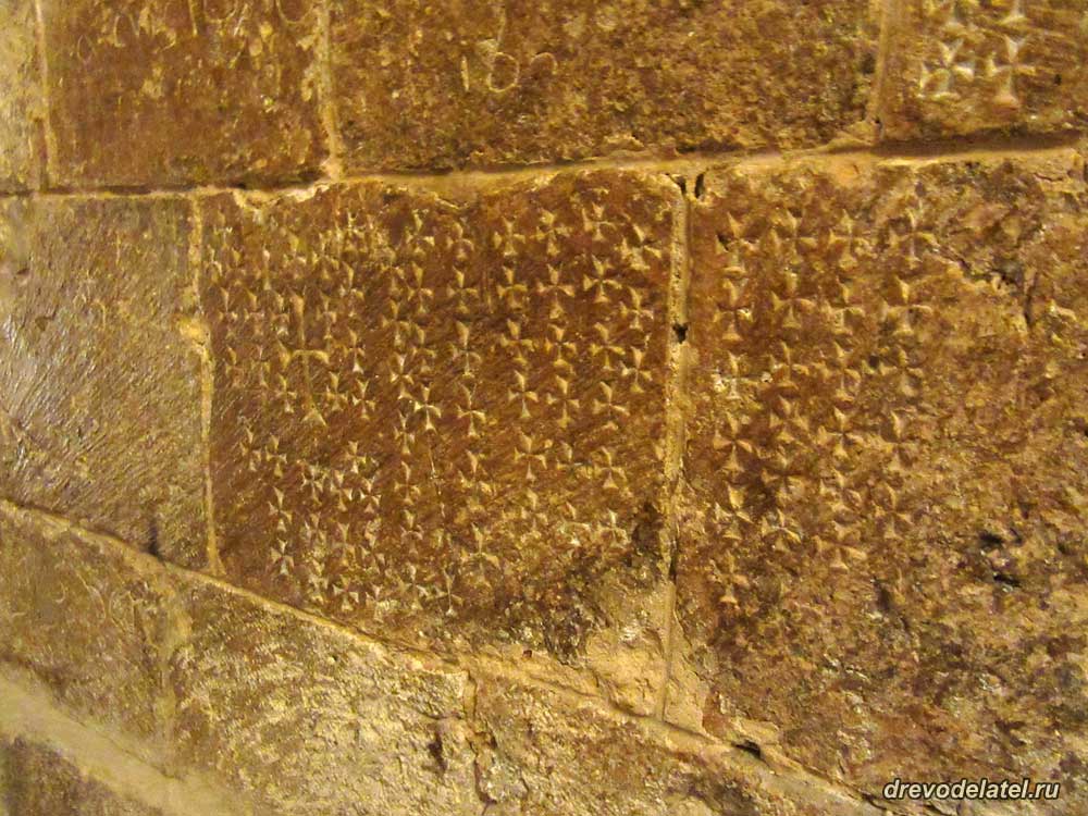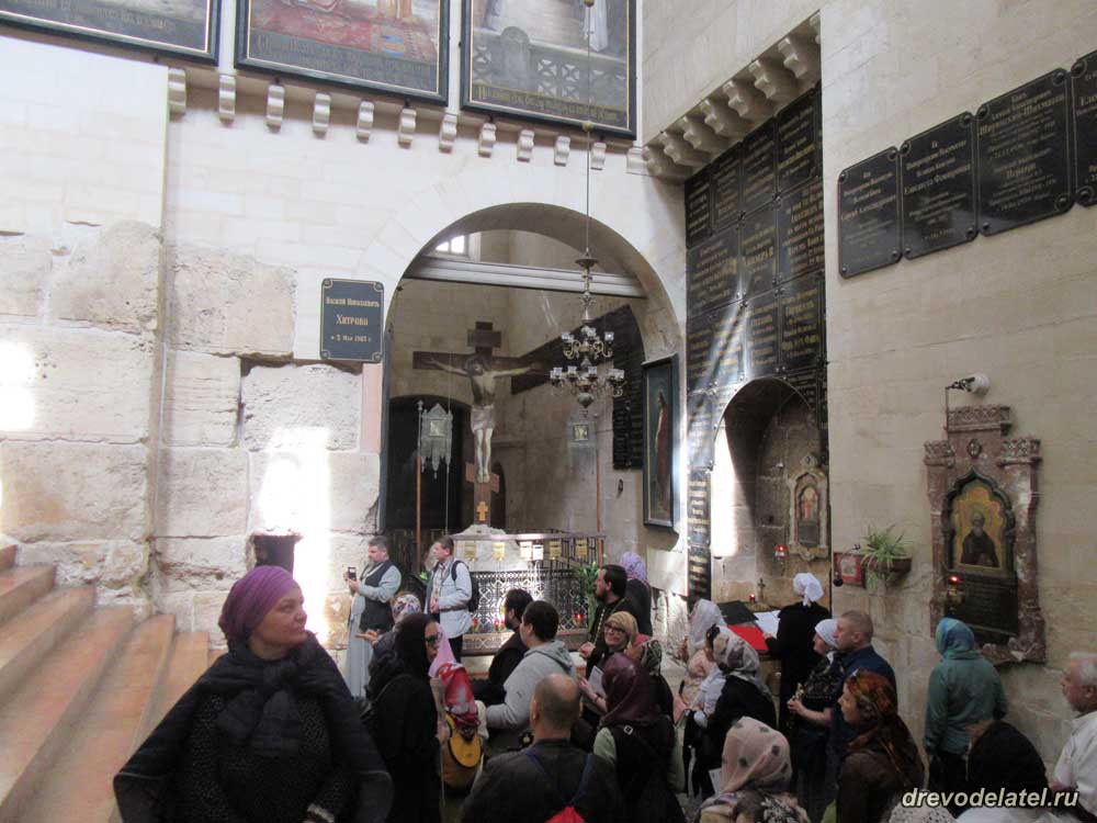 Спускаемся по лестнице мимо знаменитых крестов пилигримов в Церковь Святой Елены. Вот что пишет про храм иеромонах Арсений: «От сего места сход по 28 ступеням в подземную армянскую церковь, из коей ещё 12 ступеней ведут в подземелье, где св. Еленою обретён был животворящий крест Господень в 326 г. по Р. X. На месте обретения его, в самом углублении пещеры, устроен греческий престол.
