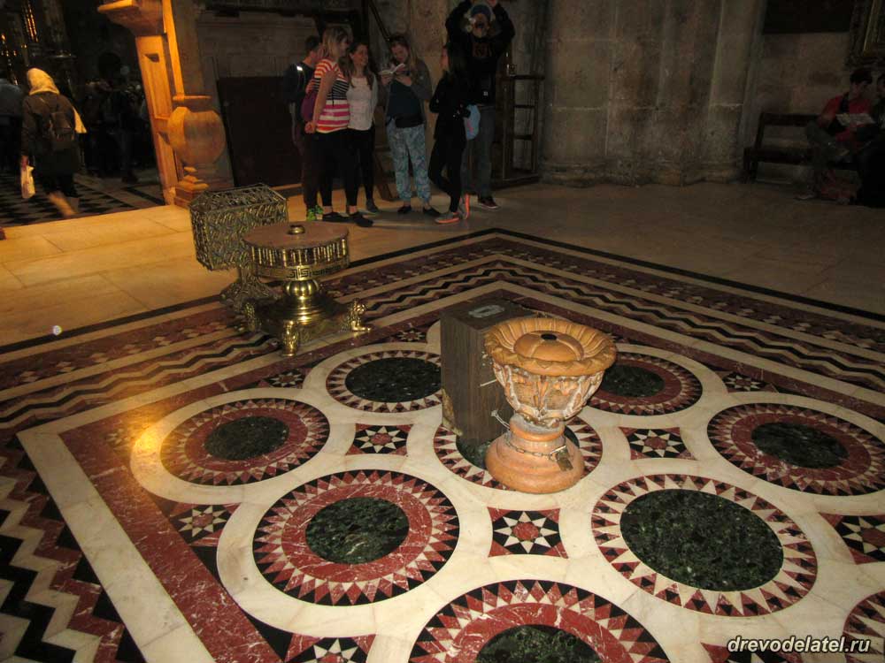Находится Омфалос на одинаковом расстоянии от Голгофы, Гроба Господня и от алтаря Кафоликона.