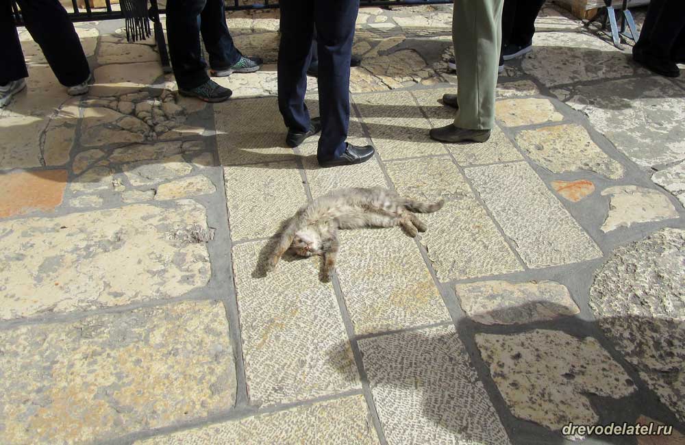 Иерусалим — город кошек. Они везде, во дворах, в храмах, на рынке, среди кустов и деревьев. Иерусалимские кошки сытые, пушистые и довольные, при этом каждая живёт на своей территории и на чужую не заходит. Во многих местах заботливыми руками оставлены миски с едой для кошек.