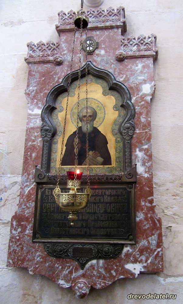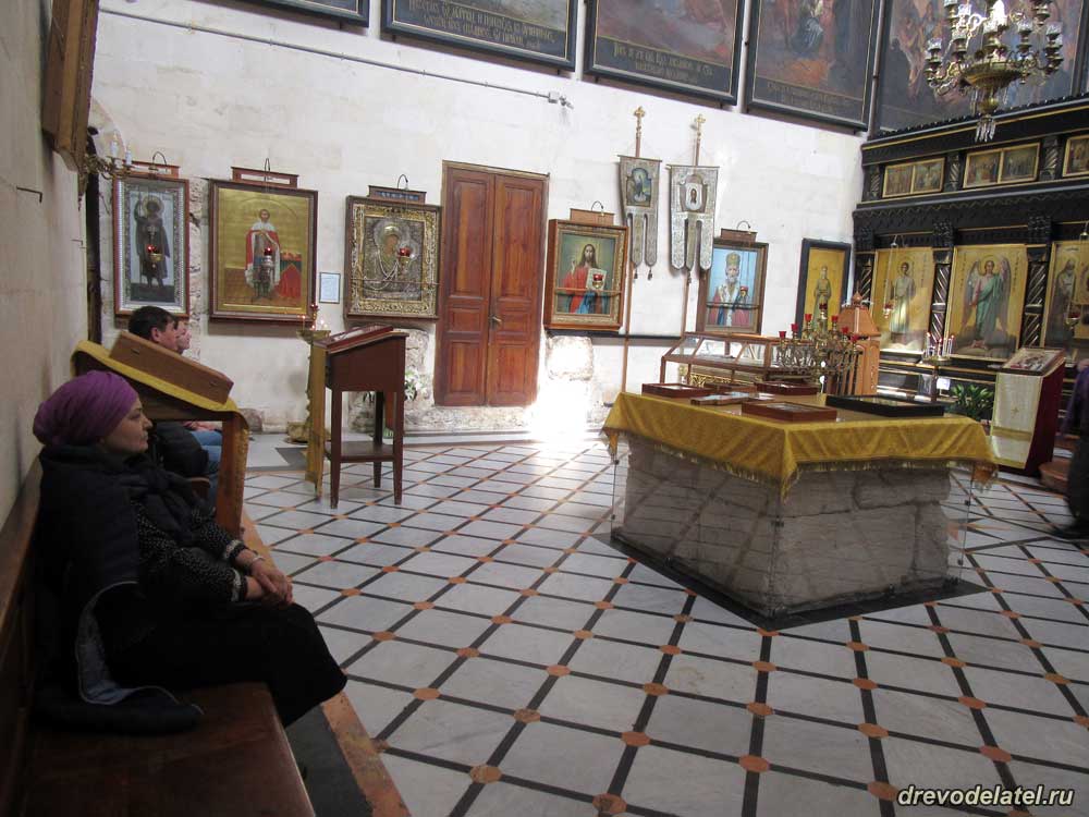 Тут же указывают каменное ложе, наподобие кресел, на котором сидела св. царица. Подземелье это находится на месте бывшей лощины, именуемой «юдолию мертвых», куда повергали тела распятых с крестами их; туда же низринут был и крест Христов, a впоследствии засыпан землёю, камнями и всяким сором».