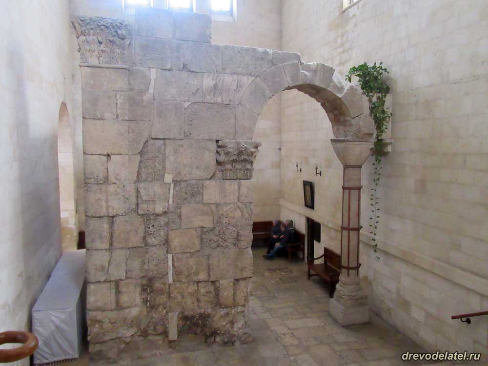 Вид на храм сбоку. Посередине церкви оставлено массивное основание столба времён крестоносцев.