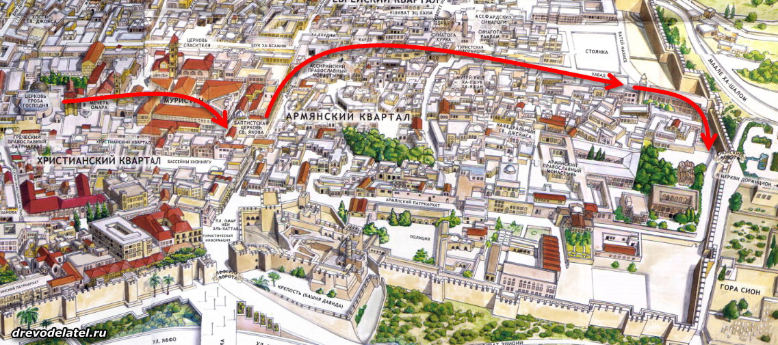 Условный маршрут от Храма Гроба Господня до горы Сион