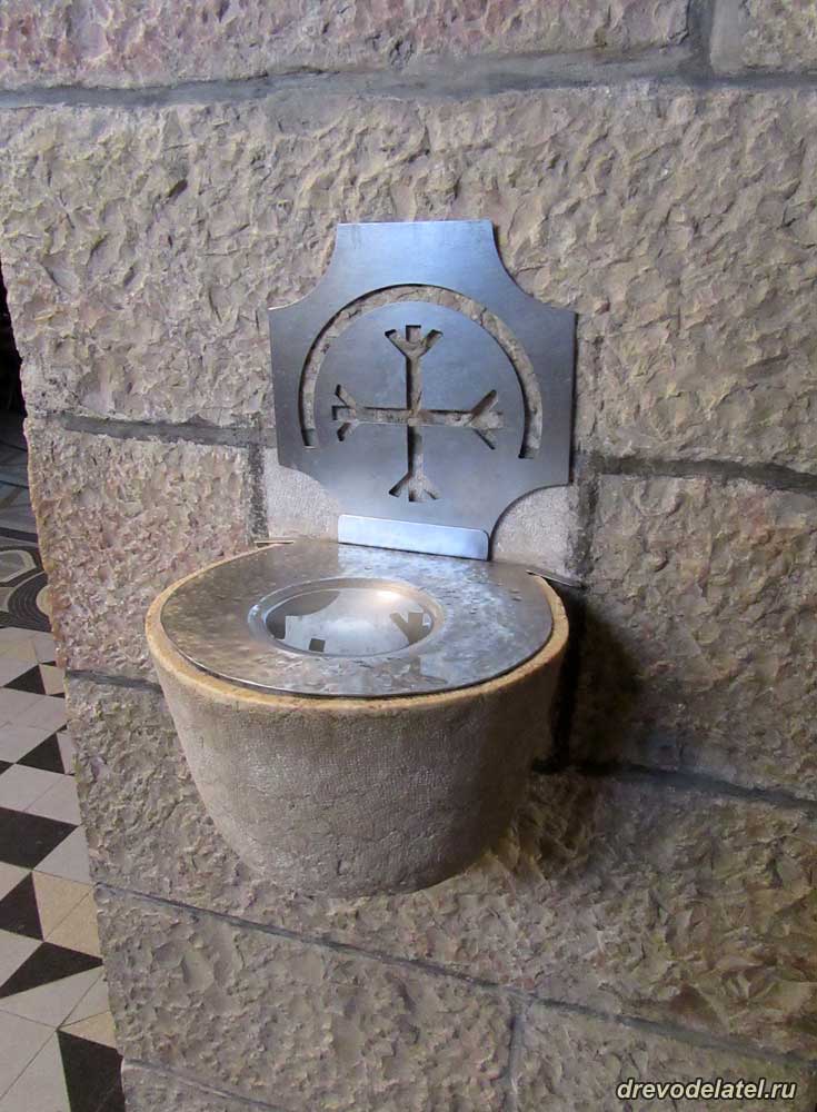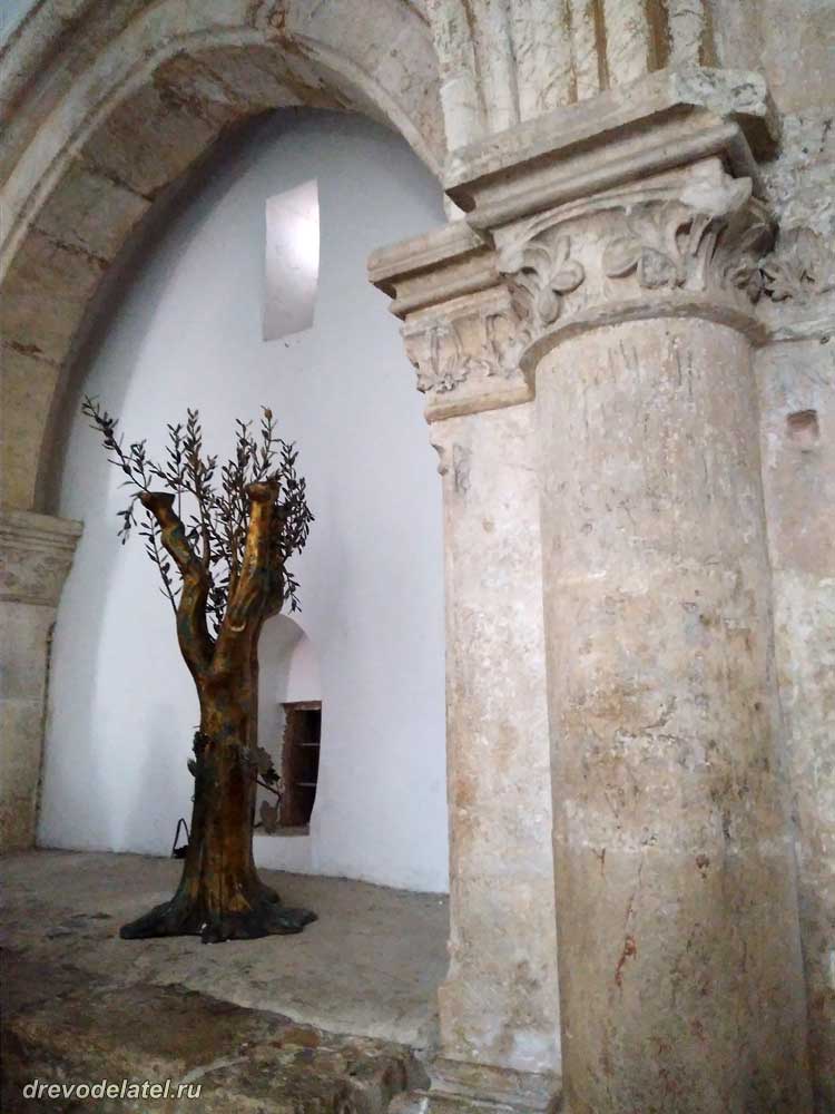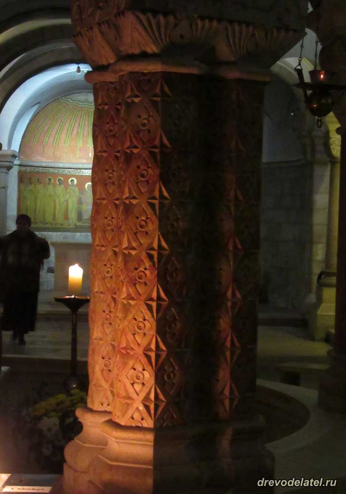 Под алтарём находится деталь византийской колонны — живая память о некогда величественной церкви Святой Сион.