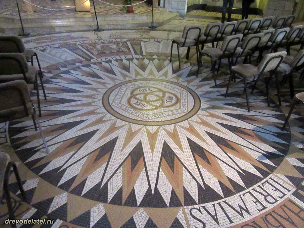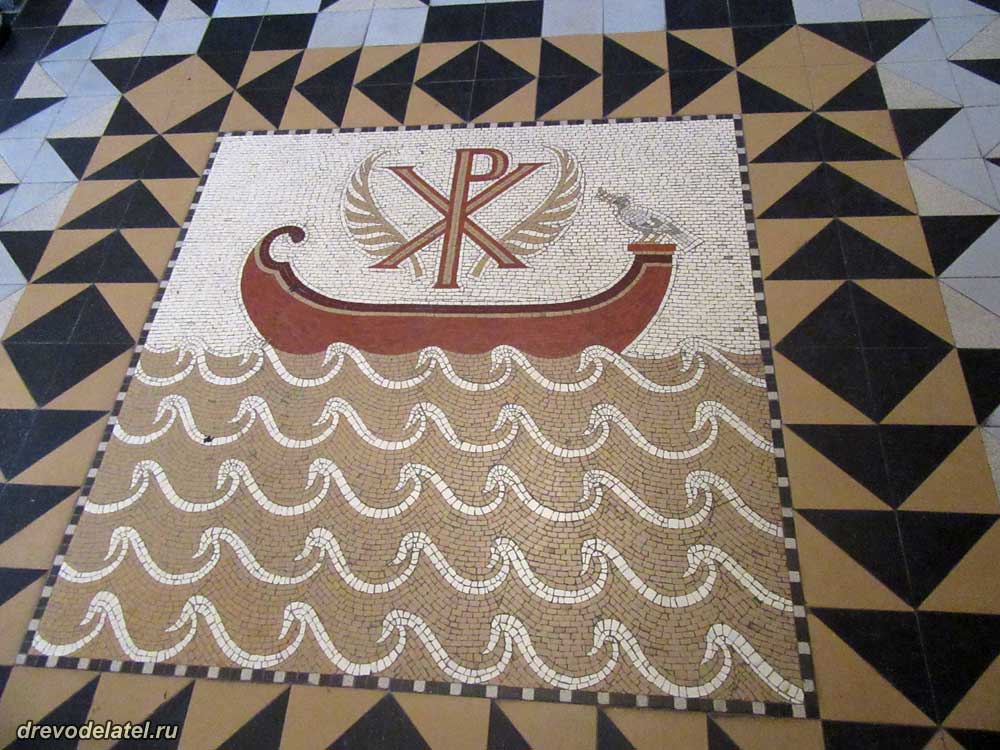 Главным украшением церкви признана великолепная напольная мозаика, выполненная Бернардом Гауэром по эскизам о. Гислера. В центре изображены три сплетённых кольца, символизирующие Пресвятую Троицу. Исходящие из них лучи проходят через кольца, с именами пророков, евангелистов и 12 апостолов. Внешний круг составляют знаки Зодиака, символизирующие установленный Творцом порядок вещей. Здесь также выложена цитата из Книги Притчей Соломоновых о Премудрости Божией: