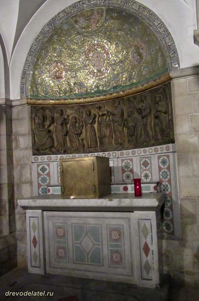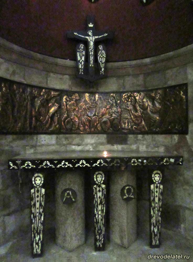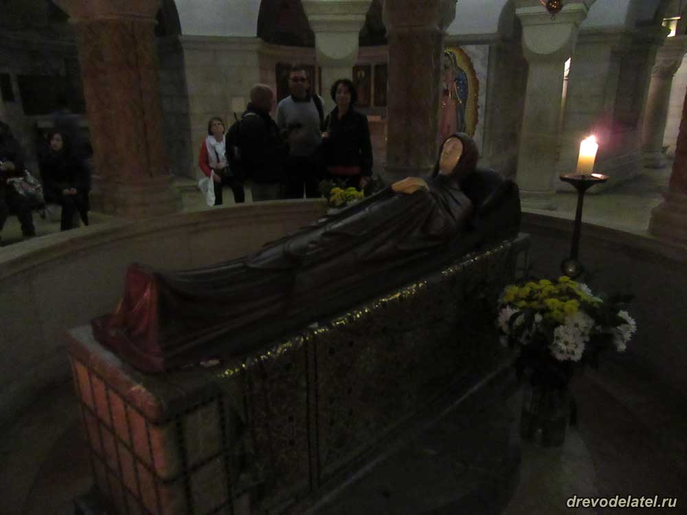 Главная святыня церкви — крипта, где, по преданию, находился одр, на котором почила в Бозе Пресвятая Богородица. На этом месте установлена статуя Девы Марии, почивающей на одре (работа о. Симона по эскизу командора Радбора), выполненная из вишнёвого дерева и слоновой кости. Статую покрывает балдахин, на куполе которого изображен Христос.