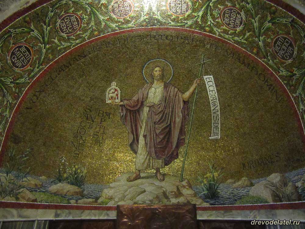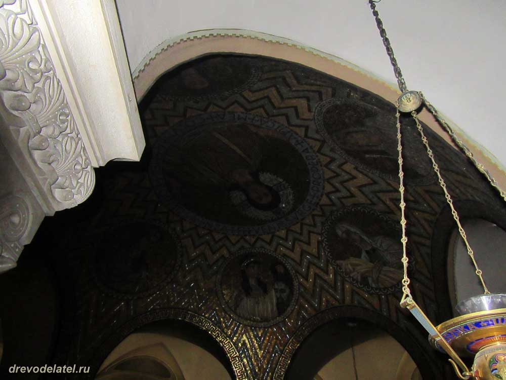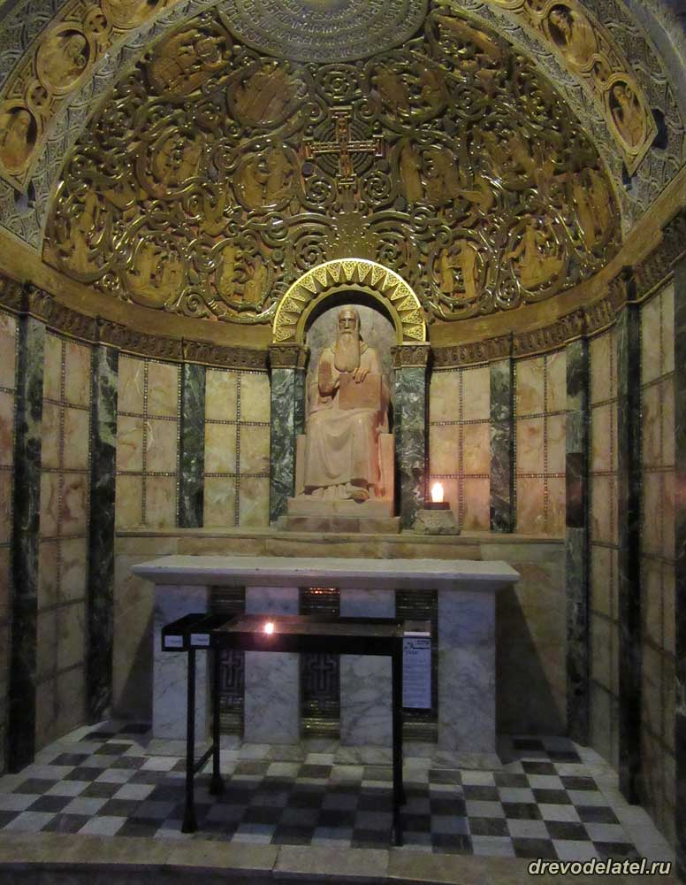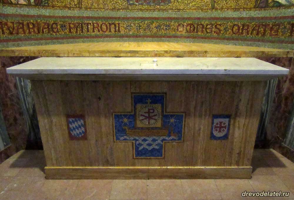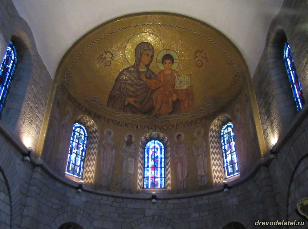 Апсида церкви, в свою очередь, украшена мозаикой, созданной по эскизу аббата Бенедиктинского ордена о. Радбора и изображающей Богоматерь Царицу Небесную.