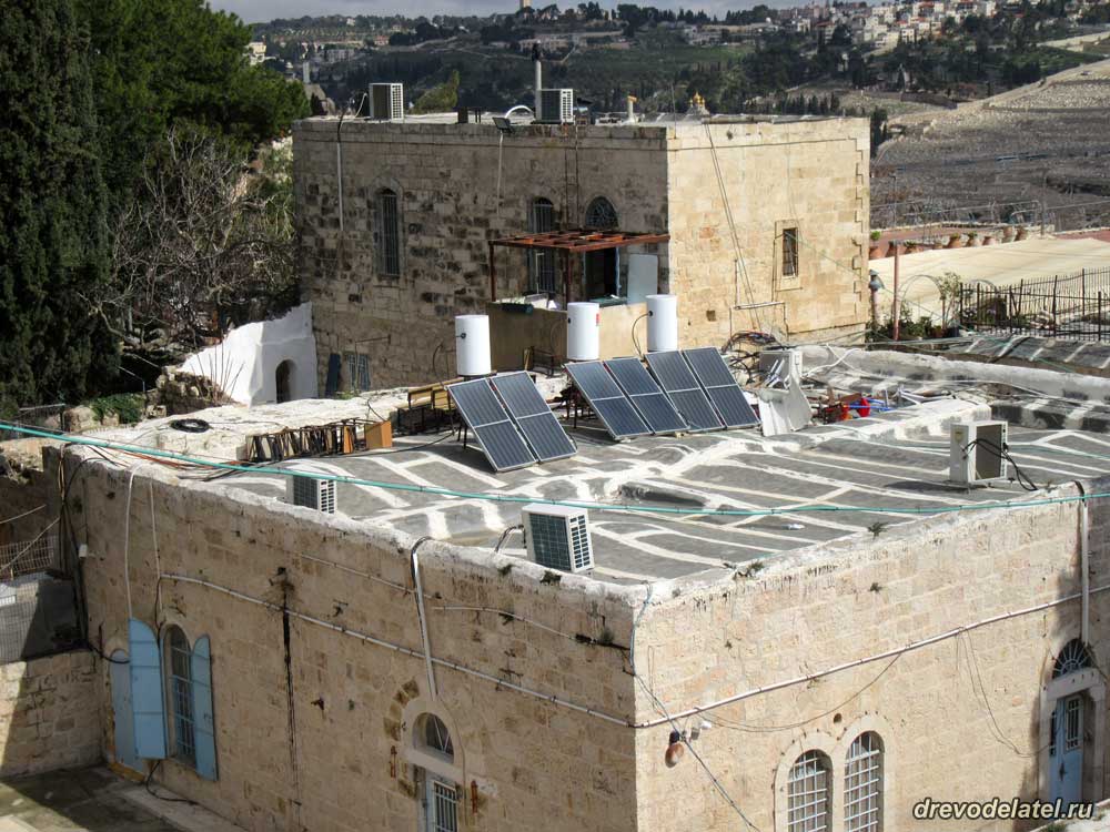 Вот такие водообогреватели с бойлерами почти на каждой крыше в Иерусалиме. Крыша покрыта рубероидом — таким же популярным кровельным материалом в Иерусалиме, как и черепица. Перехлёсты рубероида тщательно проклеены и замазаны.