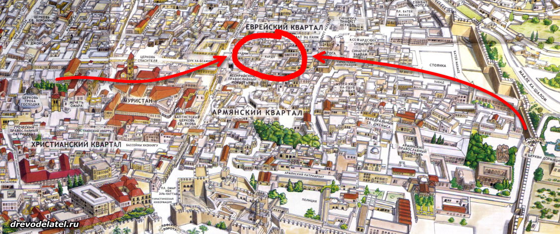 Условный маршрут к улице Кардо от Храма Гроба Господня и от Сионских ворот