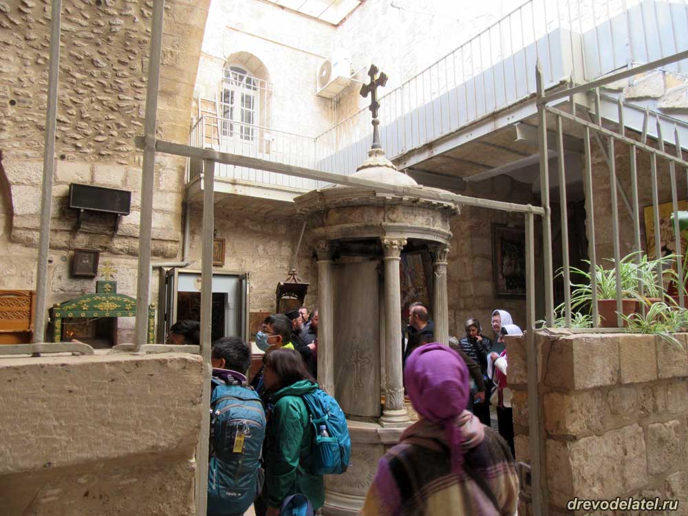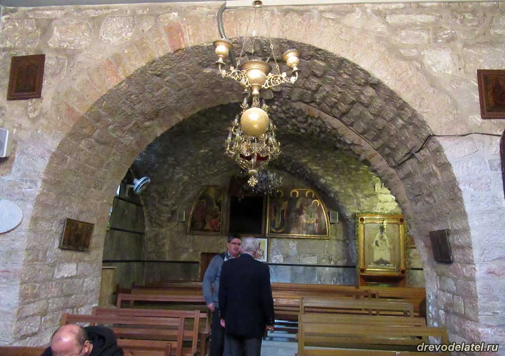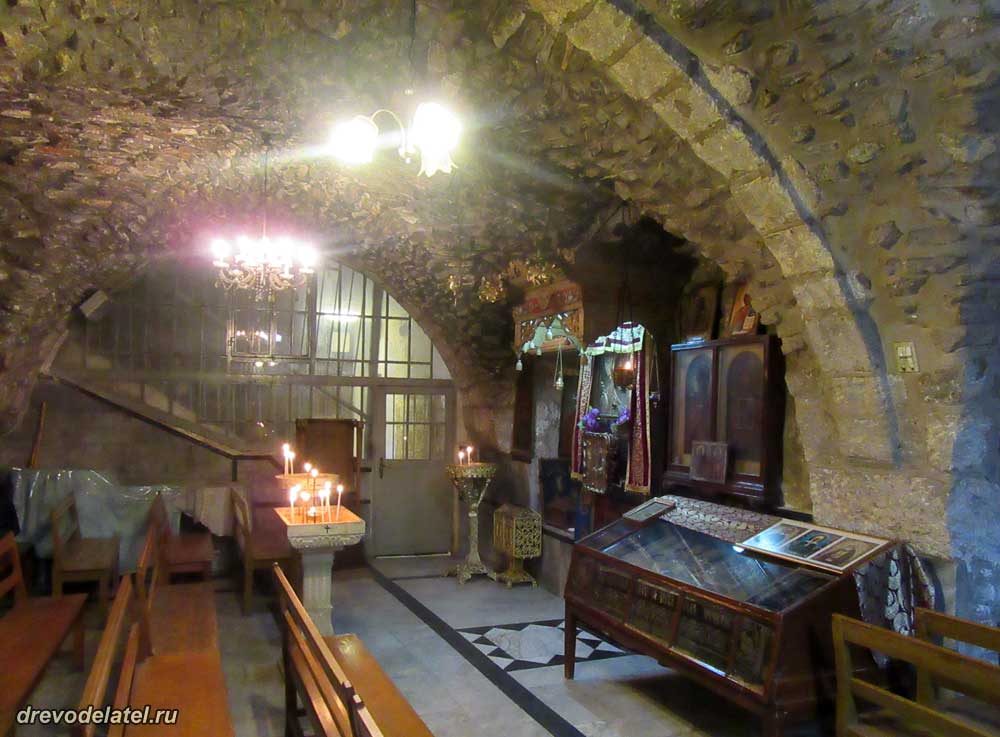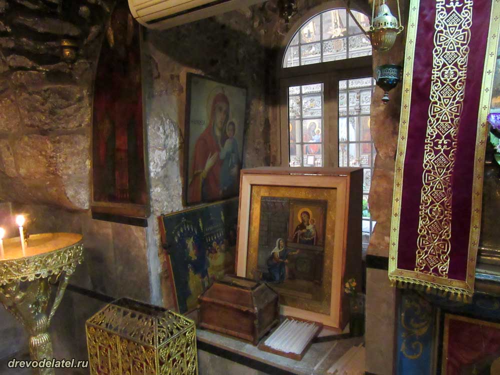 Пришли ко Храму Гроба Господня, и я обращаю внимание на открытую слева сбоку неприметную дверь — в прежние дни она была закрыта. Заходим туда, и с удивлением видим, что там богато украшенная церковь с множеством старинных икон.