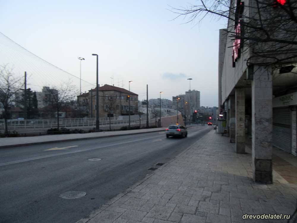 Улица Яффа пятничным вечером. По пустым трамвайным путям на Струнном мосту прогуливаются редкие прохожие.