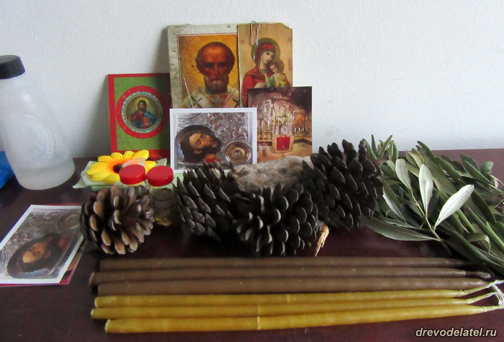 Наш святой уголок — иконки и свечи с оливковыми веточками и шишками с Елеонской горы