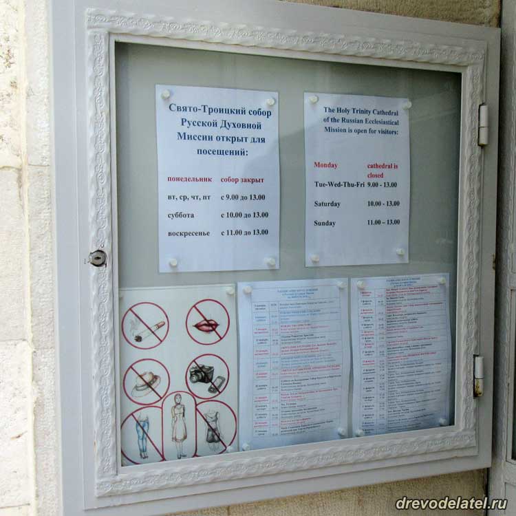 По пути зашли в Свято-Троицкий собор. Мы заходили сюда и раньше, но он был закрыт. Вход свободный, но фотографировать нельзя. Скудная лавка, почти все товары из российского Софрино, и очень дорого. Прайс на обрядовые услуги просто зашкаливает.