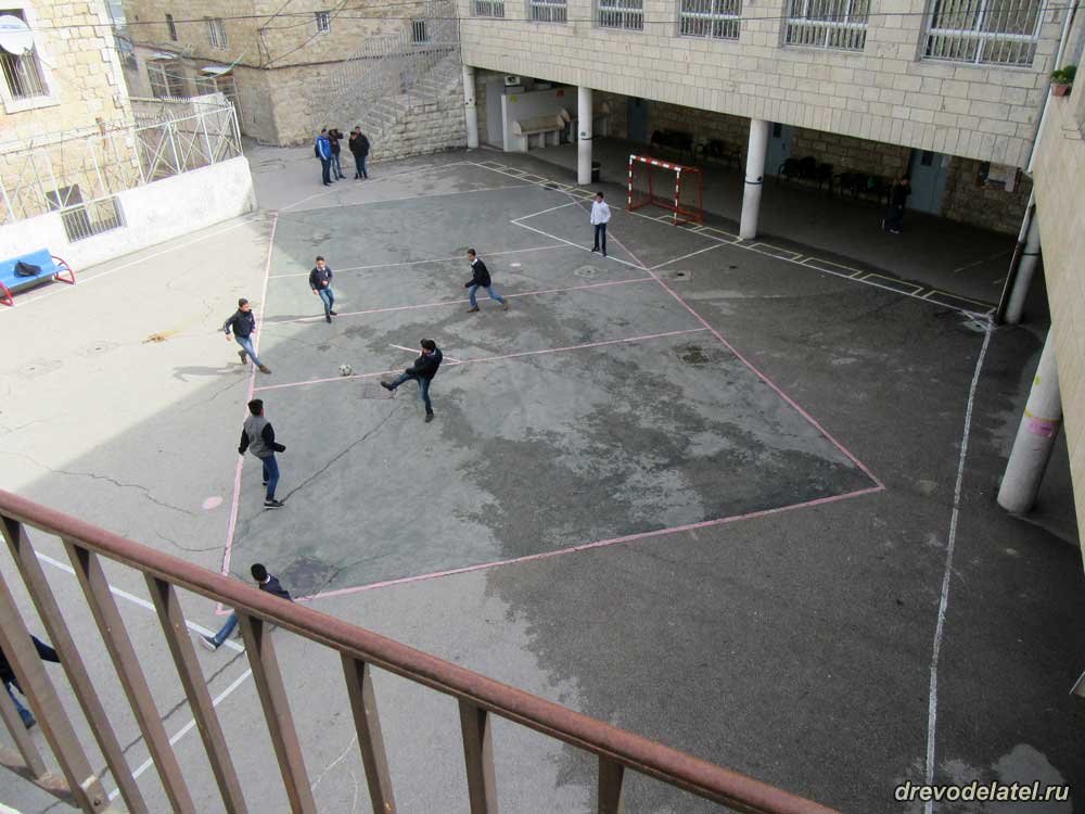 Стадион христианской школы внутри стены. Много играющих детей.