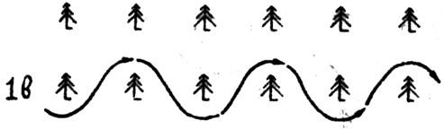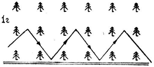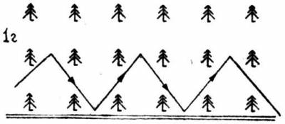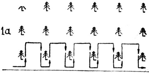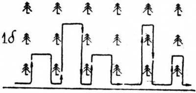 Если поиск ведется вдоль опушки леса, посаженного человеком (поперёк рядов, выходящих на опушку), то лучше всего идти «гребёнкой» (рис. 1а)