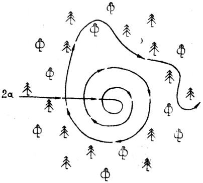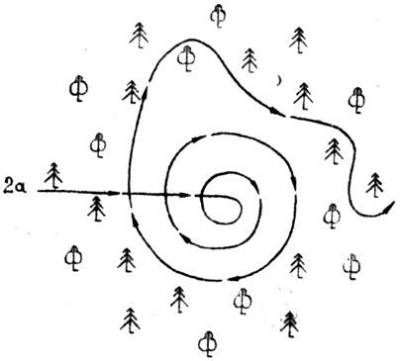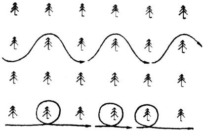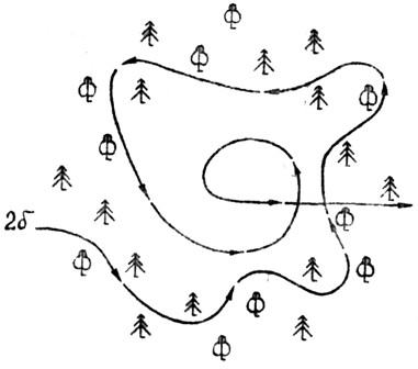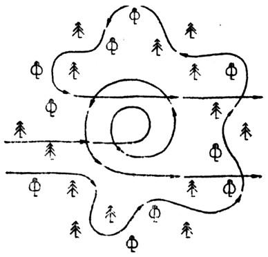 Если поиск ведётся вдоль опушки старого дубового леса, то лучше идти курсом «растянутой пружины», так как это даёт возможность осматривать деревья со всех сторон (рис. 1д).