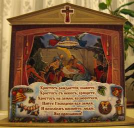Вот такой чудесный вертеп я собрал на прошлое Рождество Христово. Давно хотелось иметь ясли Христовы дома – но вырезать их из дерева не хватало времени, но, слава Богу, попался отличный скан, - и вот, праздник достойно встречен ;-) Кстати, плюс скана – на оригинале были фривольные ангелочки со стрелами (что понятно – скан был с зарубежного издания), что ну никак не соответствовало Рождеству Христову. В фотошопе я заменил этих ангелочков на нормальных, добавил тропарь, надпись и крест, и вертеп стал полноценно православным ;-)