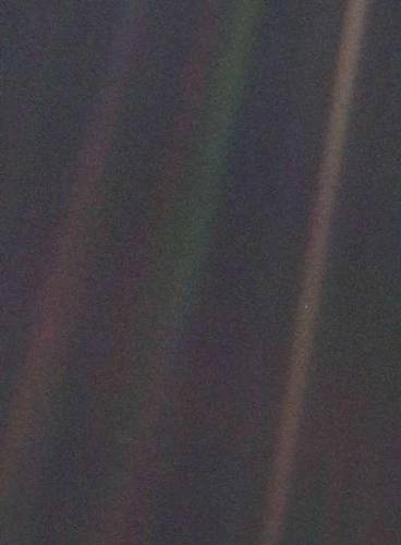 В середине февраля 1990 года аппарат НАСА «Вояджер-1», запущенный в 1977 году, удалился от Земли более, чем на 6 миллиардов километров. Его расчётный ресурс подходил к концу. Тогда, по просьбе известного американского астронома и общественного деятеля Карла Сагана, камеры «Вояджера» были развёрнуты примерно в сторону Солнца, и зонд сделал 60 фотографий. На одной из них в спектральной полосе можно разглядеть маленькую бледную точку — Землю.