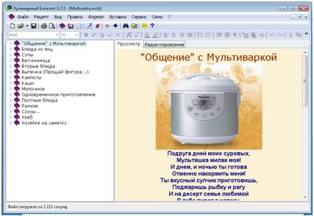 Напоследок я расскажу об очень удобной программе «Кулинарный блокнот» и рецептах для мультиварки. Всё это выложено вот на этом замечательном сайте и периодически обновляется.