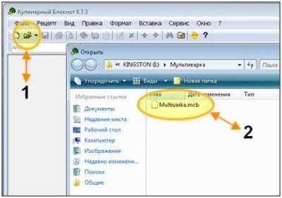 Далее открываем программу «Кулинарный Блокнот» и жмём на значок папки, затем ищем и жмём на файл «Мультиварка.mcb», нажимаем на «Открыть».