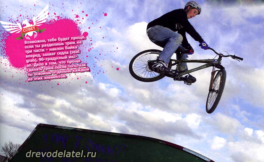 Возможно, тебе будет проще, если ты разделишь трюк на три части — наклон байка вперёд, захват седла (seat grab), 90-градусный икс-ап. Дело в том, что проще сделать трюк после того, как ты освоишь отдельно каждый из этих элементов.