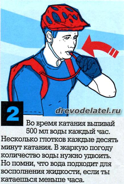 2. Во время катания выпивай 500 мл воды каждый час. Несколько глотков каждые десять минут катания. В жаркую погоду количество воды нужно удвоить. Но помни, что вода подходит для восполнения жидкости, если ты катаешься меньше часа.