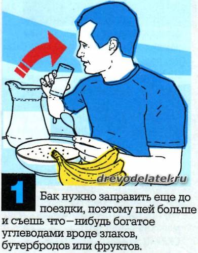1. Бак нужно заправить ещё до поездки, поэтому пей больше и съешь что-нибудь богатое углеводами вроде злаков, бутербродов или фруктов.