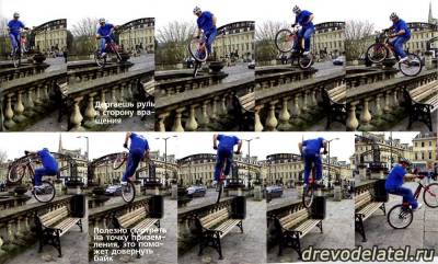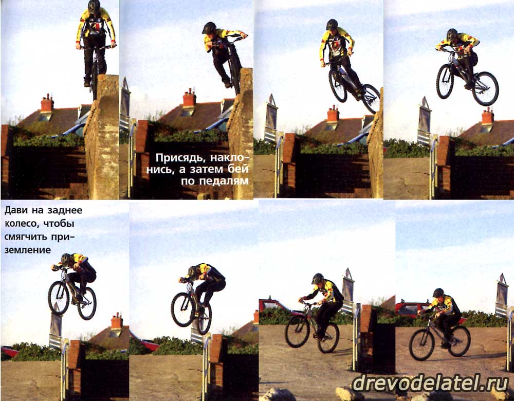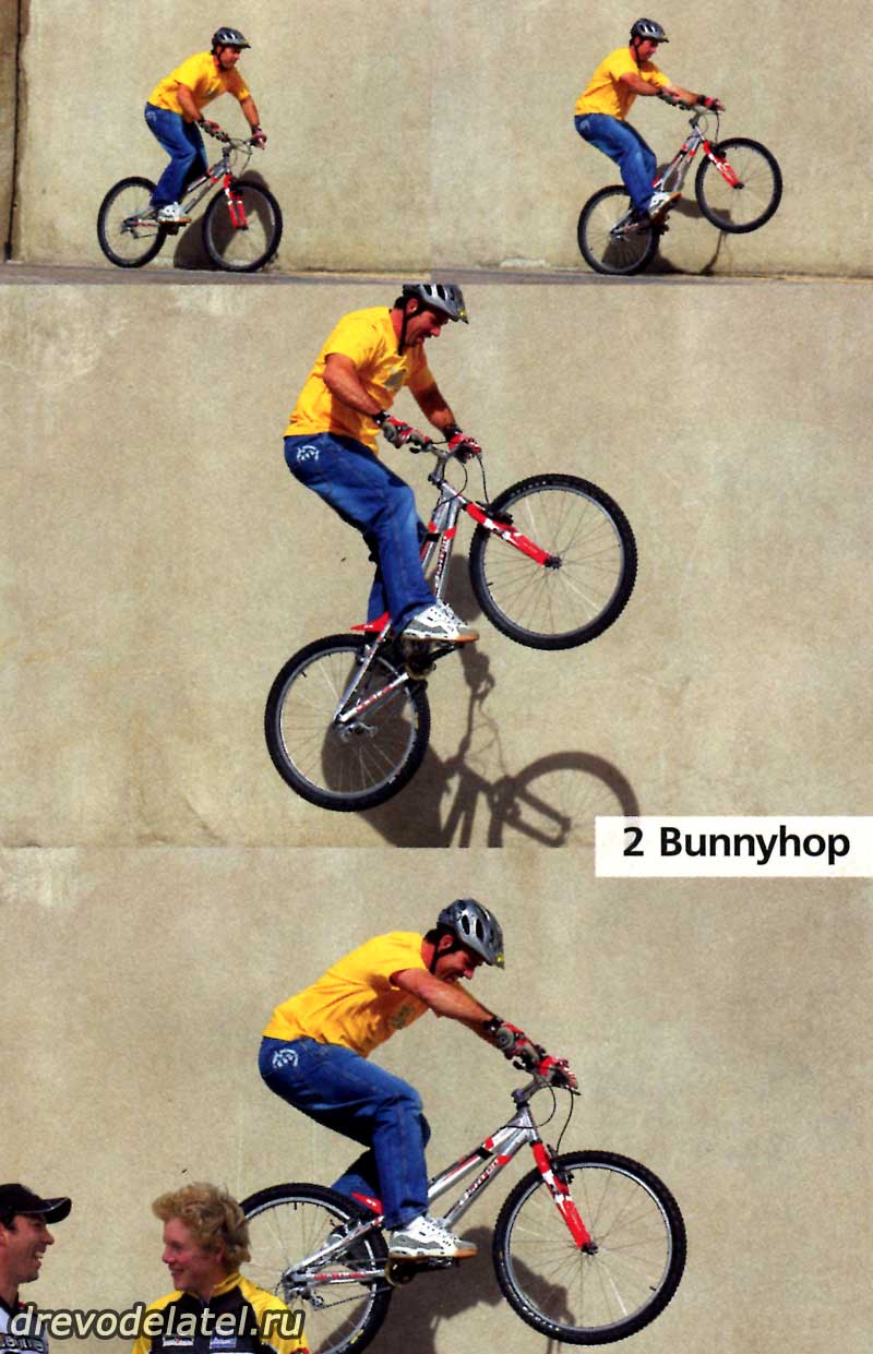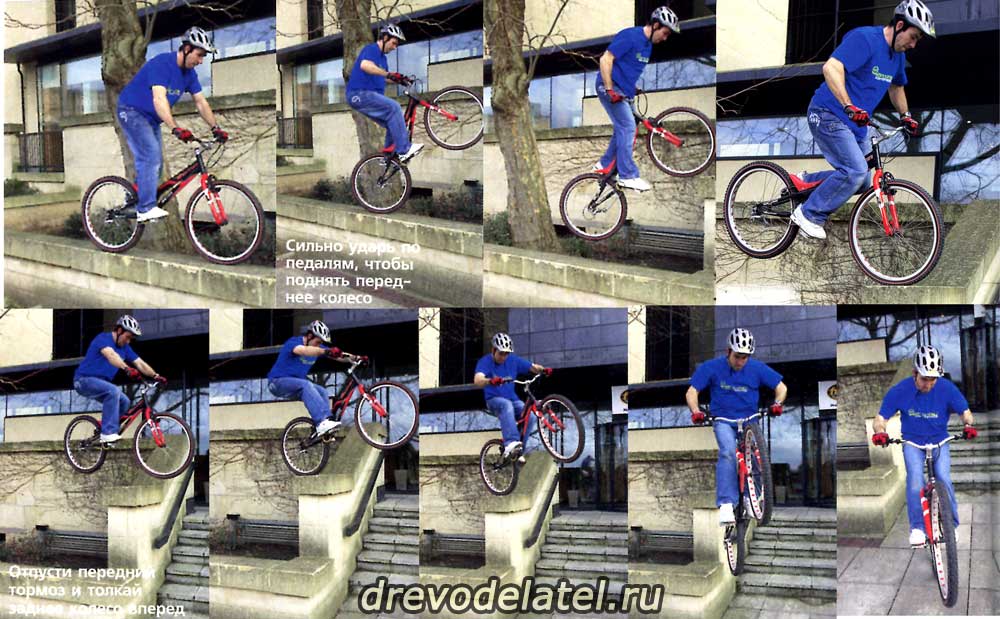 Этот продвинутый трюк позволит тебе преодолевать сложные препятствия, запрыгивая сначала на переднее колесо, а затем уже на заднее. Сначала встань на заднее колесо, а переднее должно смотреть по направлению движения. Затем сильно крутани педали, чтобы запрыгнуть передним колесом на препятствие. Как только переднее колесо на препятствии, перенеси весь вес на него и дёргай заднее колесо так, чтобы оно оказалось чуть выше переднего.
