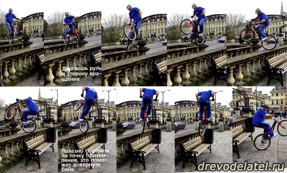 Затем сильно дёргаешь руль в сторону вращения и отталкиваешься ногами. В воздухе сильно тянешь байк за руль и педали. Используй свой вес для поворота на 180 градусов до касания препятствия задним колесом. Первая часть на этом завершена.