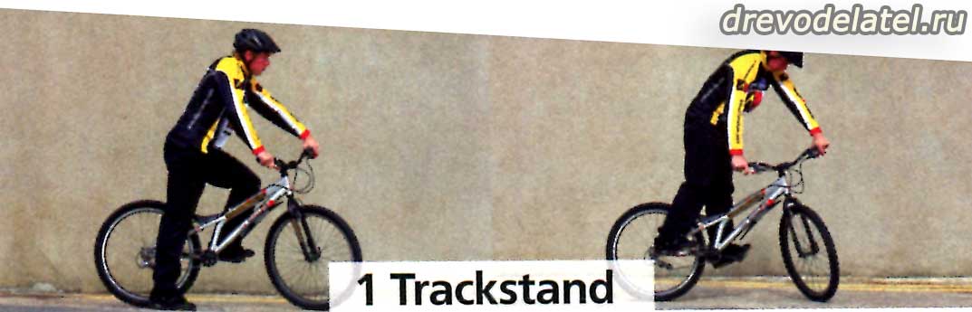 Перед тем, как сделать свой первый трек-стенд, попробуй сначала это... Прижми переднее колесо к бордюру и зажми тормоз. Это обеспечит стабильное положение байка, а ты сможешь стоять на педалях и привыкать держать равновесие. Запомни, почти всё в триале зависит от умения держать равновесие, так что трек-стенд заслуживает серьёзного внимания. Без бордюра тренировка выглядит так: