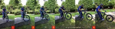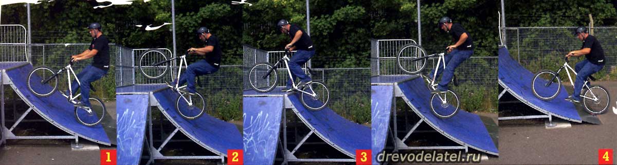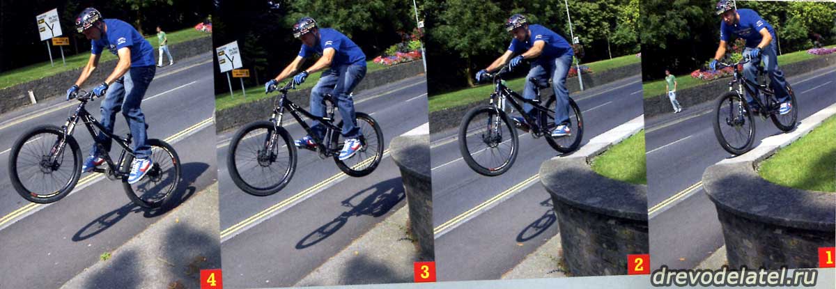 Естественно, начинай с маленькой высоты — с чего-нибудь чуть выше бордюра, чтобы можно было привыкнуть к приземлению на заднее колесо (высоты поребрика для этого может не хватить). Для начала вполне достаточно 30 см. На такой высоте, даже если ты сделаешь что-то не так, ты не покалечишься, но в то же время её хватит для того, чтобы уверенно приземлиться на заднее колесо.