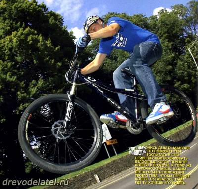 Учись делать мануал! Это поможет тебе воспитать в себе привычку контролировать велосипед, когда переднее колесо в воздухе, к тому же ты точно узнаешь, каким должно быть положение твоего тела, чтобы переднее колесо оставалось там, где ты хочешь его видеть.