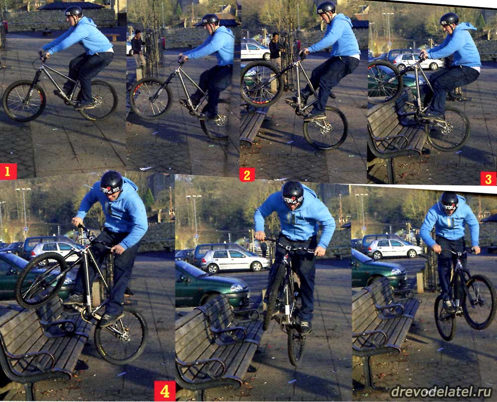 Постарайся найти препятствие в форме скамейки. Это необязательно должна быть скамейка, но желательно, чтобы при столе переднее колесо было выше заднего — из такого положения будет гораздо легче спрыгивать.