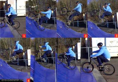 1. Эта фишка требует хорошего запаса инерции, ведь тебе придётся преодолевать уклон, а на нём гораздо сложнее, чем на плоскости, выйти на переднее колесо. Подъезжай к склону прямо, на достаточно высокой скорости.