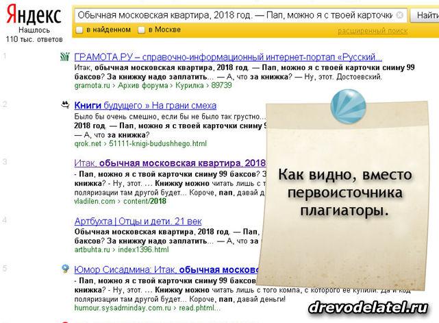 Я постоянно вижу в Яндексе такие ситуации, когда при поиске первоисточника выводятся его плагиаторы, а сам сайт-первоисточник напрочь отсутствует в поисковой выдаче. Хоть Яндекс и исправляет такие ошибки, если обратиться к ним с письменной просьбой на email, всё-таки пока для поиска первоисточника Яндекс ненадёжен.