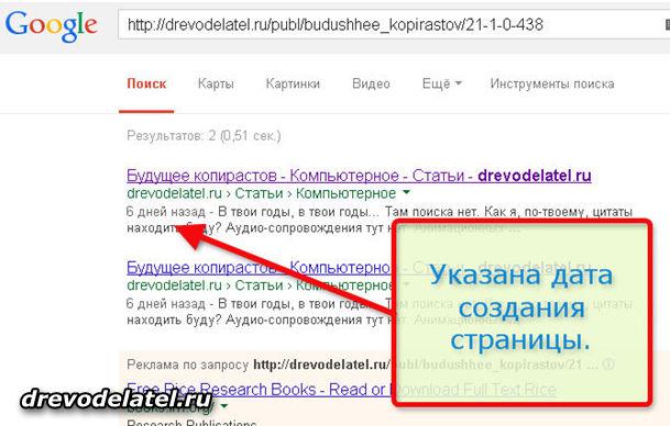 Если вы сомневаетесь в дате создания страницы, что вполне логично — ведь при редактировании статьи можно указать с потолка любую дату, её можно проверить, вбив URL-адрес страницы в поиск. Результат покажет точную дату создания страницы.