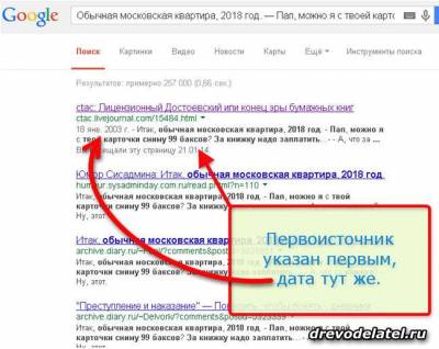 Намного удобнее и точнее искать первоисточник в Google. Гугль, как правило, выводит сайты именно по времени размещения материала, дата в поисковой выдаче указывается сразу перед кратким содержанием страницы.