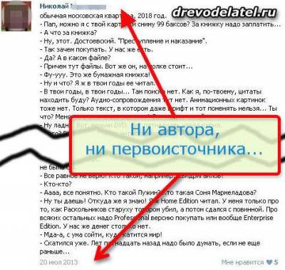 Читая одно обсуждение про скачивание книг в интернете, я наткнулся на отличную юмореску, выложенную одним человеком. Сразу же перепостил её себе во Вконтакте и собрался уже скопировать на свой сайт, указав в авторах этого человека. Ведь его пост выглядел так, как будто эту юмореску он сам тут же написал, вдохновившись дискуссией. Не было указаний ни на другого автора, ни на первоисточник.